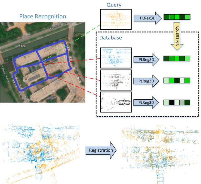 The global localization framework is shown in Figure 1. For a query point cloud (yellow), we use KNN to find the most similar point cloud (blue) based on the global descriptor of the point cloud and exclude those that are not similar (grey). This gets a coarse pose in the global coordinate system. Then, based on the local descriptors, we register the query point cloud (yellow) and its most similar point cloud (blue) to obtain an accurate pose.
